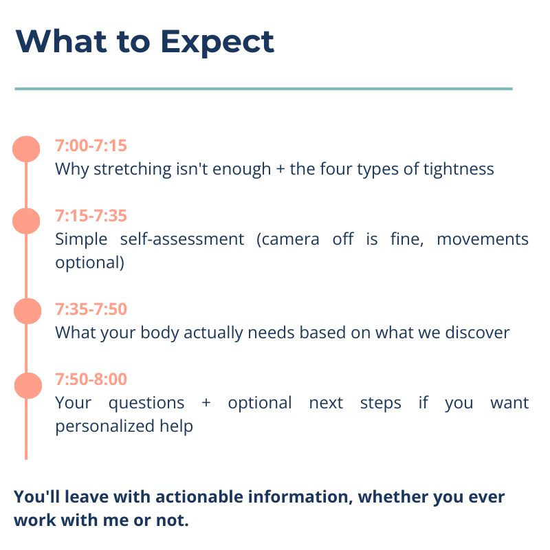 This workshop teaches you to see your body as a system. When one part isn't moving well, other parts compensate. That's what creates the tightness you feel.